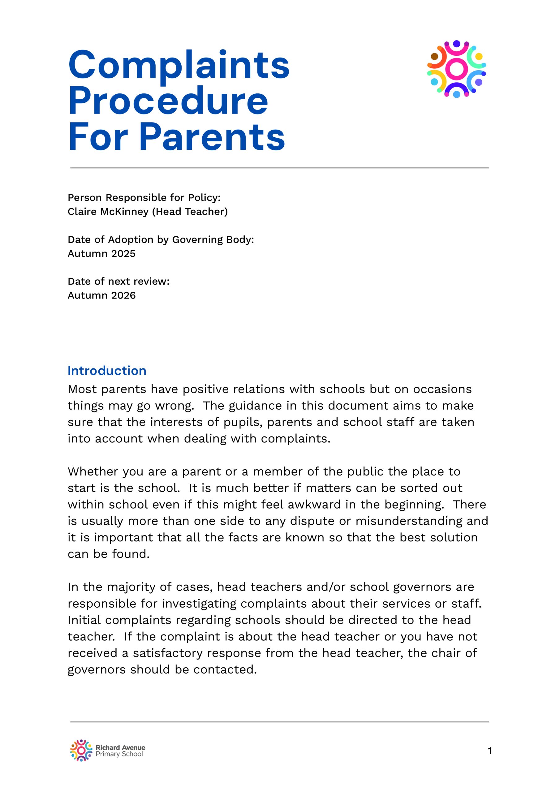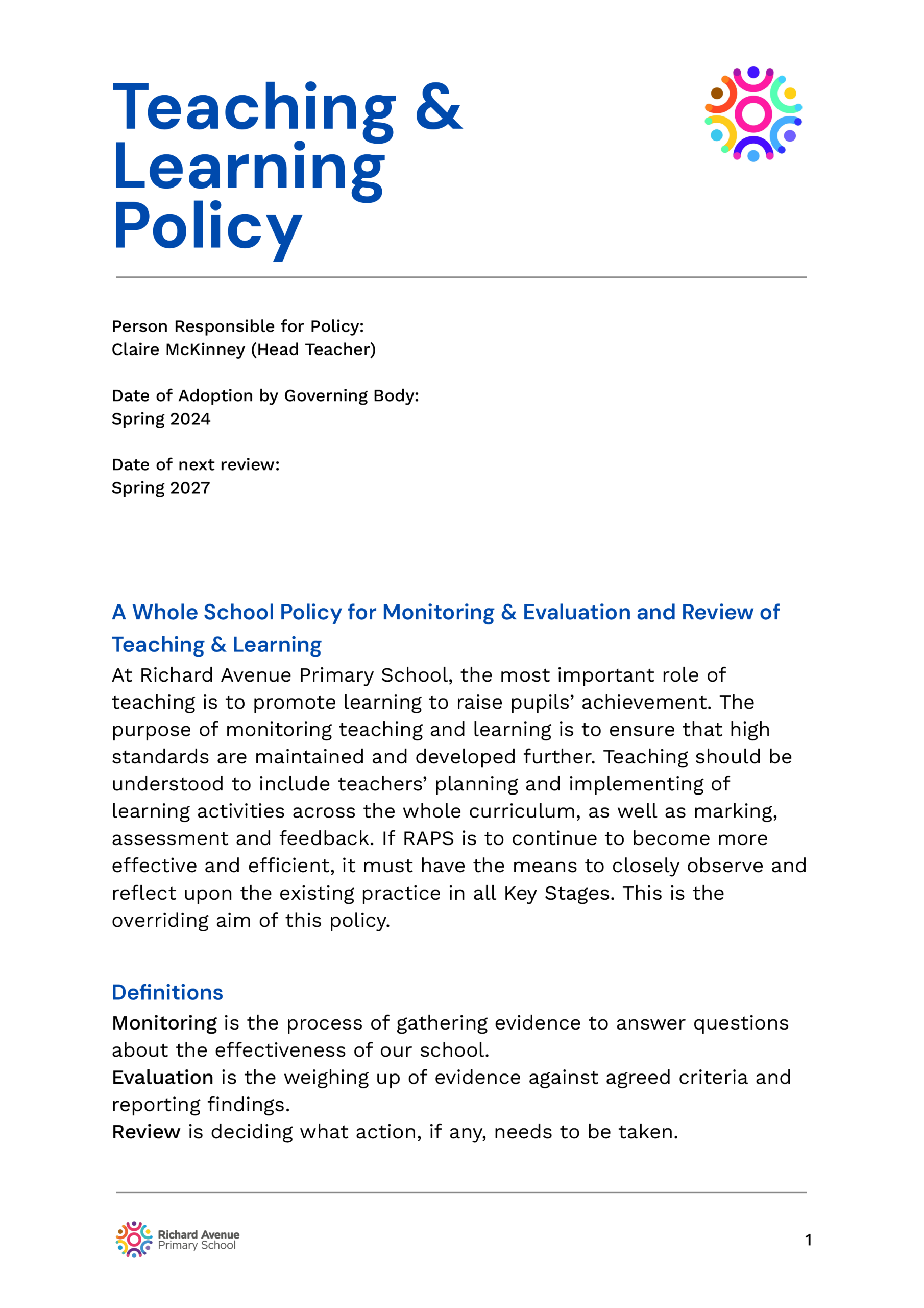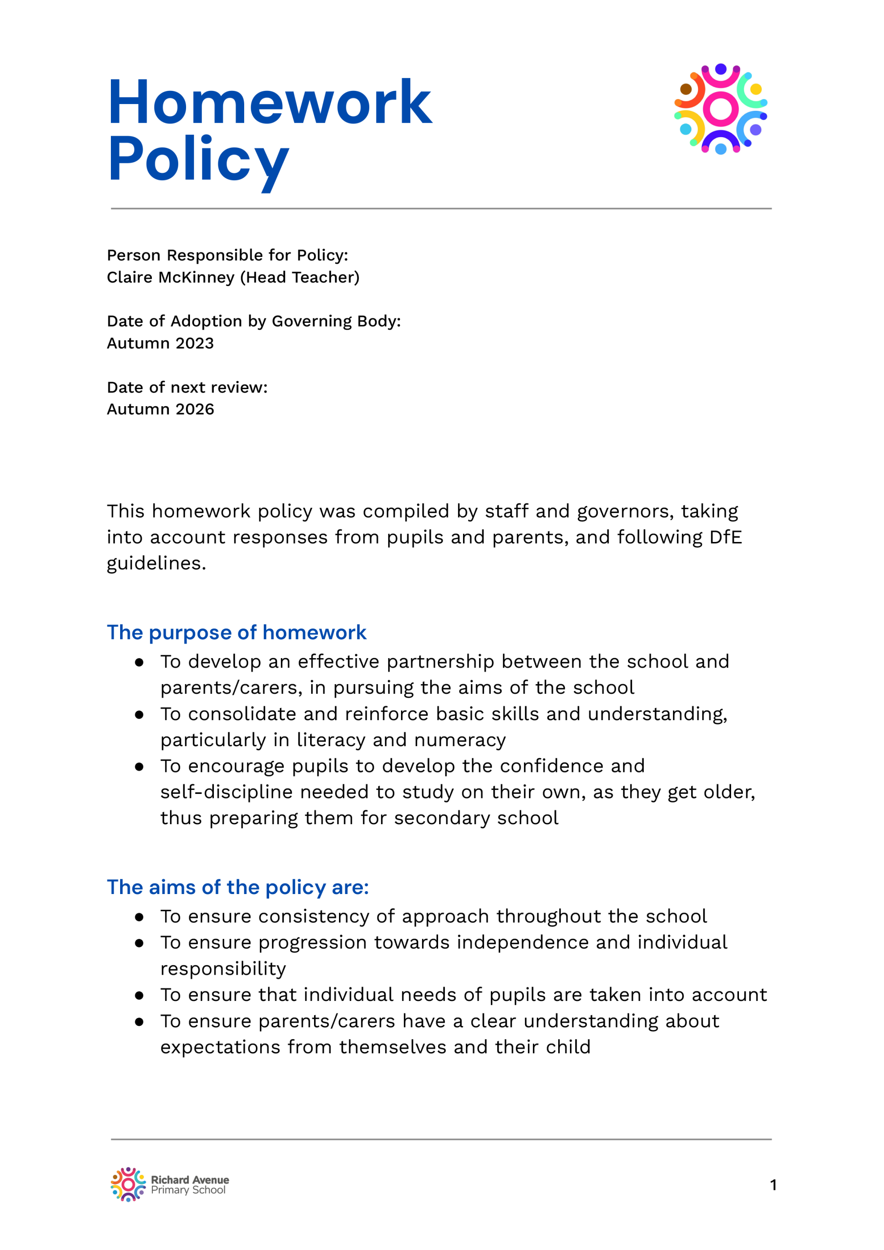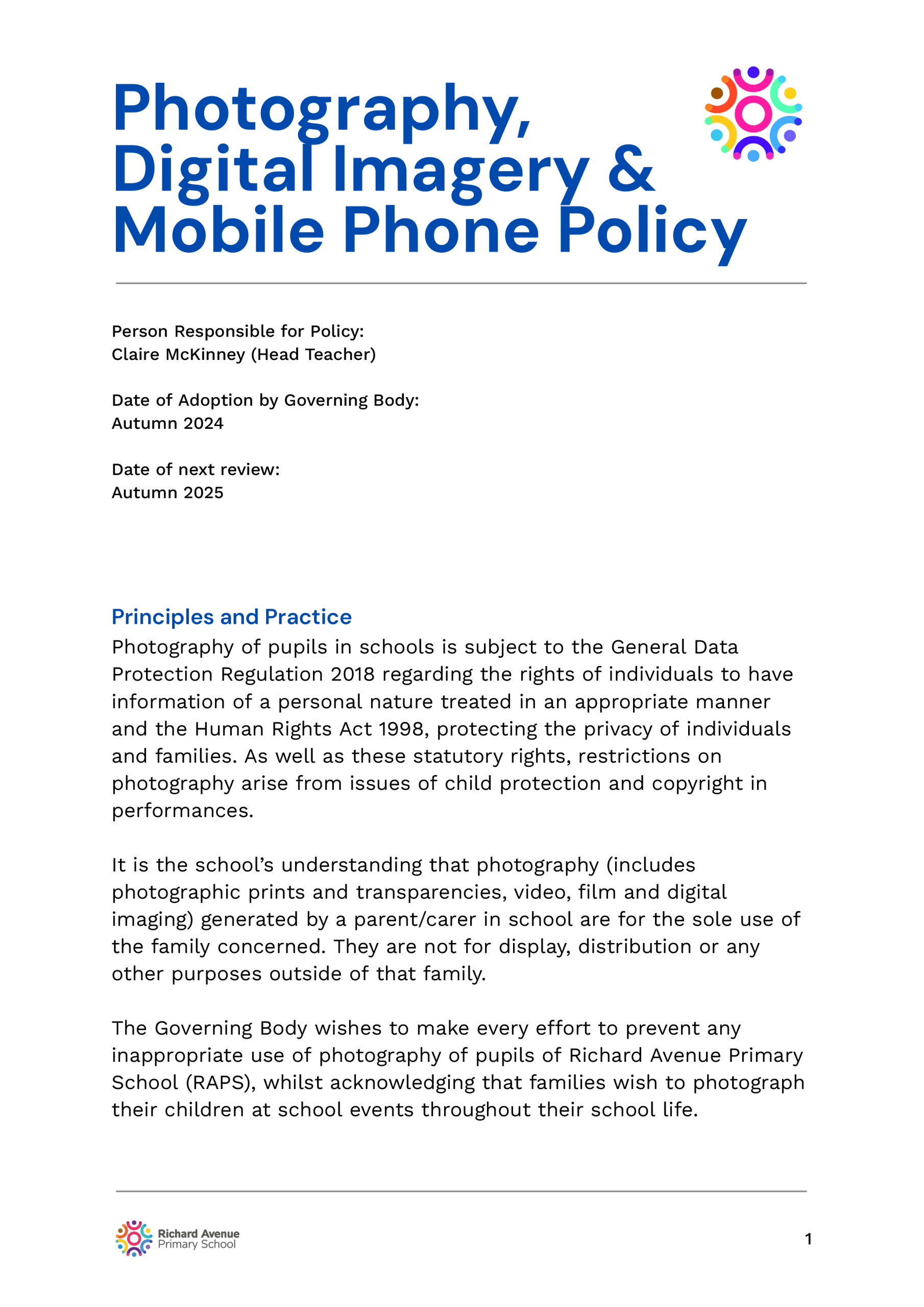 The following are school policies and other documents governing the running of the school. You can download or read these here online, print copies or request paper copies from the school provided free of charge: